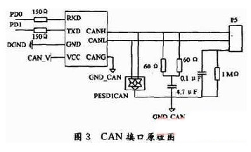 CAN接口原理圖如圖3所示,LM3S8962對應的CAN接口分別為PD0和PD1,將其與CTM8251進行電氣連接,通過對CTM8251進行相應的電路配置,并且在信號輸出端做好相應的屏蔽工作以防止噪聲干擾傳輸和靜電帶來的不安全因素,最后將CTM8251輸出的高、低端分別與器件相應引腳連接。