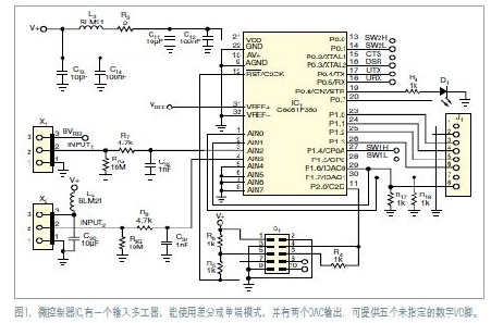 本設計中的電路包括一個混合信號微控制器、一只USBUART(通用異步接收器/發射器),還有一個新穎的自適應模擬傳感器輸入電路。此電路可以將多種類型的傳感器接到設計的兩個模擬輸入通道上,在一個USB主機上控制這些設備,讀出測量數據。USB連接為電路提供電源。在計算機上就能用簡單指令控制設備;甚至用終端軟件也可以做測量工作。8051核有免費的工具, 便于做編程工作, 如IDE(集成開發環境)、調試器以及C編譯器。