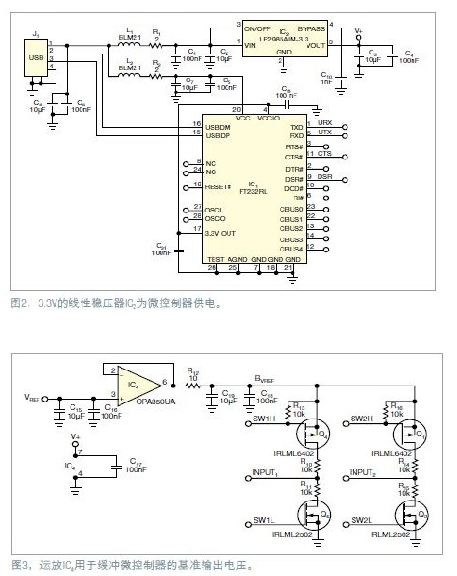 3.3V的線性穩壓器IC2為微控制器供電(圖2)。從USB端口通過磁珠與濾波器,就可以直接為USB芯片IC1供電。這款芯片是常見而可靠的USBUART芯片,可與使用任何操作系統的計算機通信。運放IC4用作微控制器基準輸出的緩沖(圖3)。