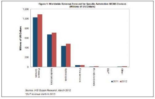 據(jù)IHS iSuppli公司的MEMS市場(chǎng)簡(jiǎn)報(bào),各國(guó)政府要求采用汽車(chē)安全傳感器的法規(guī),2012年仍將是推動(dòng)全球MEMS產(chǎn)業(yè)增長(zhǎng)的重要因素,幫助汽車(chē)MEMS營(yíng)業(yè)收入實(shí)現(xiàn)7%的健康增長(zhǎng)。