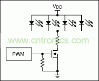 許多顯示屏模塊如今都配有一個(gè)集成控制器,用戶可以通過向控制器發(fā)送串行命令,直接設(shè)置背光亮度。如果顯示屏模塊未配備集成控制器,還可安裝一個(gè)簡(jiǎn)單的背光控制執(zhí)行器,控制顯示屏后面用于背光照明的白光LED燈的輸入電流。實(shí)現(xiàn)這種控制的一種簡(jiǎn)單辦法是:直接給LED串聯(lián)一個(gè)場(chǎng)效應(yīng)晶體管(FET),使用PWM信號(hào)快速打開、關(guān)閉FET (圖5)。然而,也可以利用單一芯片(用于LED控制的MAX1698升壓轉(zhuǎn)換器)準(zhǔn)確、可靠地調(diào)節(jié)(圖6),請(qǐng)參考應(yīng)用筆記3866“Low-power PWM output controls LED brightness”,獲取詳細(xì)信息。