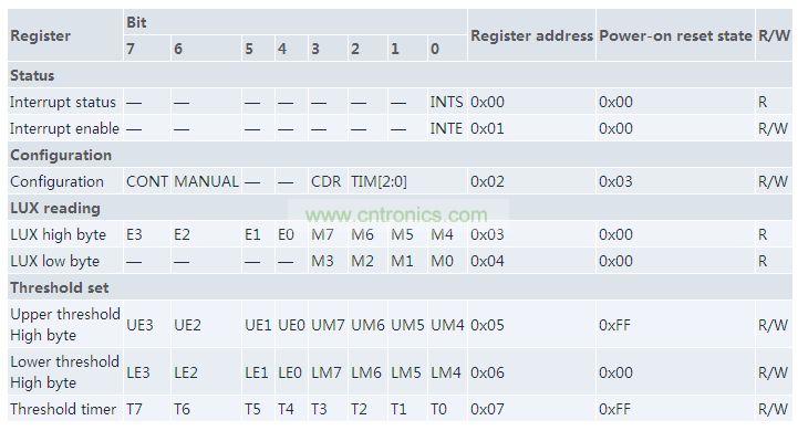 光傳感器的I²C寄存器如表1所示。