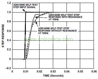 確定傳感器步進響應對于隔離在確定帶寬特性時觀察到的諧振條件很有用。圖1所示為一種采用ADIS16080的系統的頻率響應。圖中所示諧振頻率為100 Hz。開始時,該諧振到底是傳感器行為導致,還是系統中的機械諧振所導致,這并不清楚。幸運的是,步進響應(如自測功能所確定)可以區分這兩種效應。圖2顯示了兩種條件下的坐標曲線圖:測試設置導致的諧振和傳感器本身導致的諧振。