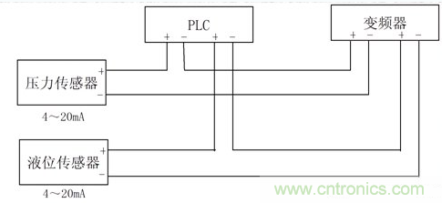 對于傳感器輸出的電流信號,只經(jīng)PLC和變頻器的輸入阻抗之和不大于傳感器的輸出負載阻抗即可,壓力傳感器的信號可以同時串入PLC和變頻器,如只有壓力傳感器信號,則PLC和變頻器也都可以正常接收壓力傳感器的信號。而當液位傳感器的信號也同時接入PLC和變頻器時,因PLC接收信號的-端都在變頻器的+端,當兩傳感器的信號電流不一樣時,就有可能使PLC兩-端的電位有較大的差異,就就形成了共模干擾電壓。如PLC輸入端又互相不是隔離的,則會造成PLC的模擬信號輸入端接收不正常。變頻器的兩輸入信號是在PLC的后面,其-端電位可保持在變頻器內(nèi)部電路設(shè)定的狀態(tài),問題不大。
