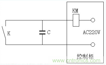 由于開關(guān)K離接觸器KM較遠,兩根電線很長導致其分布電容C將變得很大,在交流電路中,這個分布電容中將有位移電流流過,即使開關(guān)K斷開也可能因KM維持能量不需太大而導致KM不釋放,設(shè)備停不下來,此時,可以按以下方法解決: