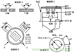 人體都有恒定的體溫,一般在37°C左右,會發出10mm左右特定波長的紅外線,被動式紅外探頭就是靠探測人體發射的紅外線而進行工作的。紅外線通過菲涅耳濾光片增強后聚集到熱釋電元件,這種元件在接收到人體紅外輻射變化時就會失去電荷平衡,向外釋放電荷,后經檢測處理后就能產生報警信號。被動紅外探頭,其傳感器包含兩個互相串聯或并聯的熱釋電元件,而且制成的兩個電極化方向正好相反(如圖2側視圖C),環境背景輻射對兩個熱釋元件幾乎具有相同的作用,使其產生釋電效應相互抵消,于是探測器無信號輸出[3]。