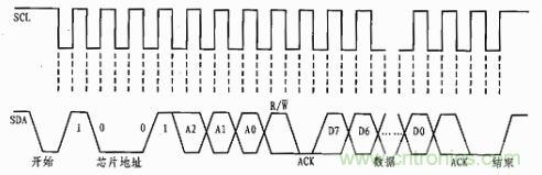 AD7416采用I2C串行總線和數據傳輸協(xié)議來實現同外設的數據傳輸。在數據傳輸過程中AD7416作為從器件通過數據輸入/輸出線SDA以及時鐘信號線SCL與總線相連。其傳輸時序如圖3所示。當SCL保持高電平時,SDA從高電平到低電平的跳變?yōu)閿祿鬏數拈_始信號,隨后傳送AD7416的地址信息的讀/寫控制位。其地址信息的格式為:100A2A1A0R/W。
