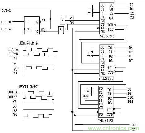 當光電編碼器順時針旋轉時,通道A輸出波形超前通道B輸出波形90°,D觸發器輸出Q(波形W1)為高電平,Q(波形W2)為低電平,上面與非門打開,計數脈沖通過(波形W3),送至雙向計數器74LS193的加脈沖輸入端CU,進行加法計數;此時,下面與非門關閉,其輸出為高電平(波形W4)。當光電編碼器逆時針旋轉時,通道A輸出波形比通道B輸出波形延遲90°,D觸發器輸出Q(波形W1)為低電平,Q(波形W2)為高電平,上面與非門關閉,其輸出為高電平(波形W3);此時,下面與非門打開,計數脈沖通過(波形W4),送至雙向計數器74LS193的減脈沖輸入端CD,進行減法計數。