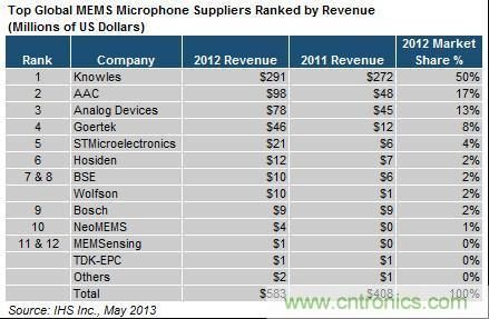 隨著市場(chǎng)的發(fā)展,MEMS麥克風(fēng)市場(chǎng)的格局也在不斷的變化中。在HIS最新的分析報(bào)告顯示,樓氏電子繼續(xù)主宰MEMS麥克風(fēng)市場(chǎng),2012年以2.9億美元營收傲視所有其它供應(yīng)商,樓氏一家營收已實(shí)際占到整個(gè)MEMS麥克風(fēng)市場(chǎng)的一半。中國AAC和歌爾聲學(xué)排名第二和第四,ST異軍突起,擠進(jìn)前五。