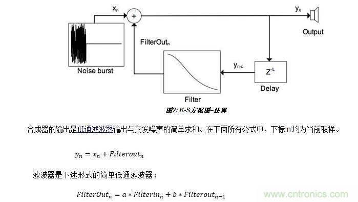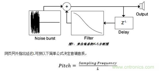 數(shù)字聲音合成技術(shù)總讓我這個(gè)業(yè)余愛(ài)好者感到著迷。一個(gè)有關(guān)Karplus-Strong吉他合成技術(shù)的維基網(wǎng)頁(yè)更加激發(fā)了我的興趣。它吸引我的地方是這種合成器設(shè)計(jì)非常簡(jiǎn)單。下面是來(lái)自維基網(wǎng)頁(yè)的圖形(圖1):