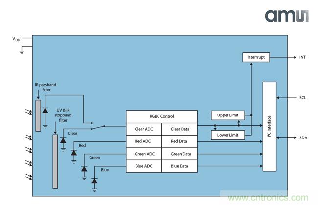 四個獨立的模擬數字轉換器(ADC)分別對應一個RGB通道, C通道和紅外線通道共用第四個模擬數字轉換器。四個通道同時取樣能避免快速變化的光照條件下CCT和光照強度的測量出錯。TCS3490傳感器的光電二極管被安排在一個輻射狀結構上,因此光線從任意方向射入都能獲得一致的有效響應,尤其是從圓形的窗口中射入的光。當光線測量值或顏色測量值超過預設的閾值時,傳感器會向處理器發送中斷信號,避免處理器不停地通過I2C接口輪詢,幫助降低整個系統的功耗,延長電池壽命。