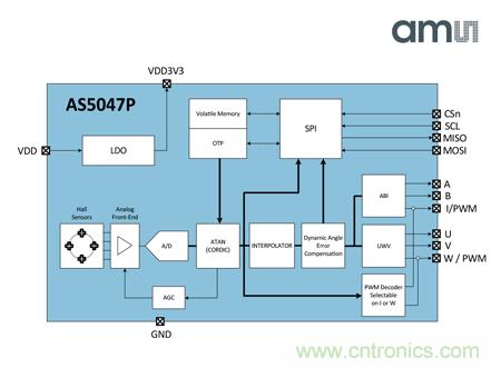 【導讀】近日,ams發布47系列最新磁性旋轉位置傳感器AS5047P。該傳感器可實現高轉速下、全溫度范圍內的最高精確度,可用于電機與運動控制。AS5047P具備遞增式ABI輸出,性能更優于電機及運動控制系統中的光學編碼器及旋轉變壓器,在實現高精度性能的同時能降低系統成本。