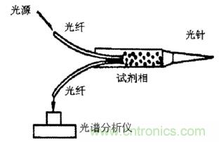 采用光傳感器測量 pH 值的原理,是利用透射光和發射光的強度隨波長分布光哭進行測定的,在纖維素膜盒中插入兩條光纖,然后將針頭插入血管或者組織中,試劑會和體液混合,吸收特定波長的光,然后使用分析儀將測量這種變化,分析后即可得到組織或者血液的 pH 值。