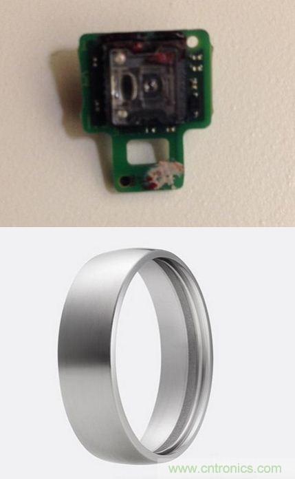用戶可以旋轉Nest恒溫器的外圈來選擇選項。這個光電鼠標上的發射器/傳感器組合就是用來檢測旋轉的器件。外圈內部可以看到光學鼠標元件用來檢測旋轉的溝槽圖案。