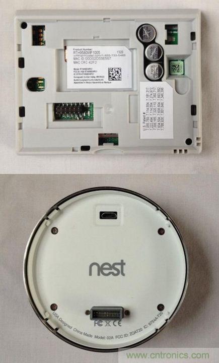 霍尼韋爾恒溫器的單個PCB上包括多個DC-DC轉換器、穩壓器和整流器、一個8通道12位ADC、128MB SDRAM、32M閃存和博通(Broadcom)Wi-Fi模塊(屏蔽罩移除)。主處理器是愛特梅爾(Atmel)926 ARM處理器,外面包覆了金屬屏蔽罩,僅在扁平帶狀電纜至顯示器下方可見。Nest恒溫器的主要電子元器件全部被包覆在單個屏蔽罩下。靠近底部的兩個附加電路提供檢測功能。PCB與顯示器通過螺絲固定,金屬環被卡在兩者之間,但可以自由旋轉。