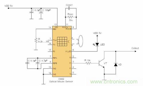 鼠標芯片的CMOS光學(xué)傳感器可提供非機械式跟蹤引擎。在該芯片內(nèi)部可完成圖像的捕獲、數(shù)字化和數(shù)字處理。就拿簡單且低成本的OM02來說,該傳感器通過采集表面圖像幀來測量位置,并通過數(shù)學(xué)運算判定運動方向和距離。該傳感器安裝聚苯乙烯光學(xué)封裝中,設(shè)計用來與高亮度LED一起使用。它有一個完整且緊湊的跟蹤引擎;沒有活動部件,也不要求精密的光學(xué)對準。OM02可以為X和Y方向運動產(chǎn)生正交輸出信號。分辨率約為0.0025英寸,運動速度最高為每秒16英寸。