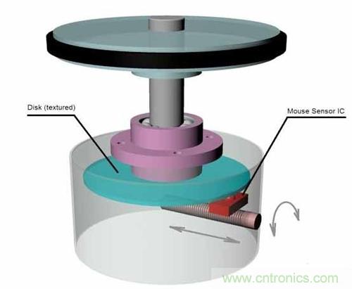 【導(dǎo)讀】本設(shè)計實例使用光學(xué)電腦鼠標中的傳感器測量圓盤的旋轉(zhuǎn),其中的圓盤可以通過機械方式連接到任何一種旋轉(zhuǎn)裝置。通過沿著圓盤半徑改變傳感器位置,該方案可以調(diào)整每次旋轉(zhuǎn)的脈沖。