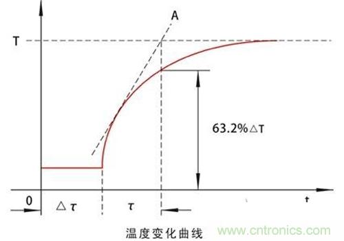 實(shí)踐證明熱電偶、熱電阻、雙金屬溫度計(jì)當(dāng)被測(cè)溫度突然發(fā)生變化時(shí),其輸出會(huì)延遲一段時(shí)間,這段延遲時(shí)間△τ一般叫做純滯后或純時(shí)延。在延遲△τ后,會(huì)以近似于指數(shù)曲線的規(guī)律變化(如下圖所示),如忽略△τ,并以介質(zhì)溫度變化做計(jì)時(shí)起點(diǎn),則上述曲線符合T=△T(1-e-t/τ),此式中T為溫度;△T為溫度變化;t為時(shí)間;τ為時(shí)間常數(shù)。時(shí)間常數(shù)及時(shí)反應(yīng)曲線起點(diǎn)的切線與平衡溫度交點(diǎn)A所對(duì)應(yīng)的時(shí)間,也就是輸出變化63.2%△T所需要的時(shí)間。