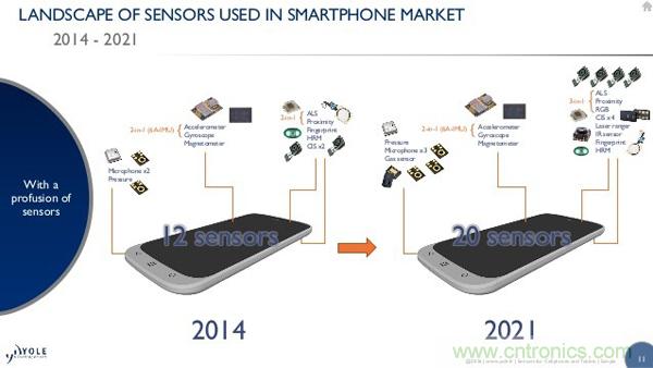 根據(jù)有關(guān)機構(gòu)的預(yù)計,2014年智能手機內(nèi)的平均傳感器數(shù)量為12顆,而到2021年這一數(shù)量將增加到20顆;除了一些必要的同類傳感器數(shù)量會增多之外,也有不少針對專業(yè)領(lǐng)域的機型會考慮搭載一些普通消費者無法想象的傳感器。