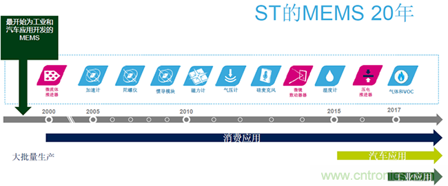 在過去的20年,消費類應用使不同類別的MEMS傳感器實現了從雛形,到大批量生產、直至大批量應用的過程,這些傳感器包括加速計、陀螺儀、慣導模塊、磁力計、氣壓計、溫度計、氣體壓力計、以及最近幾年越來越多的環境類傳感器。