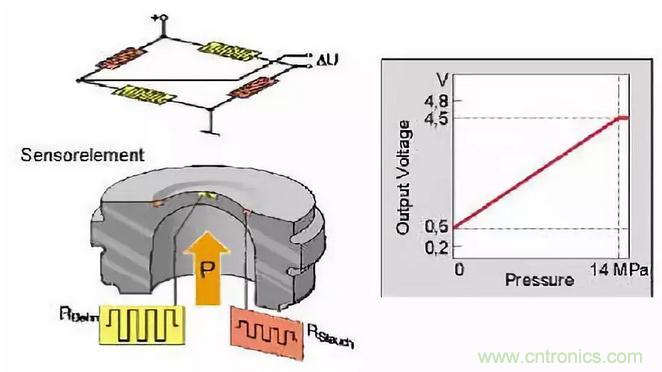 的惠斯頓電橋,膜片的變形導致應變計電阻變化,通過外圍電路的的信號處理后,形成與壓力成線
