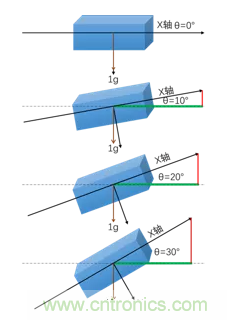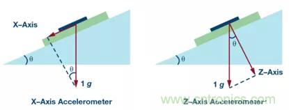 如下圖,坡度角θ。下圖左邊,檢測軸X軸垂直于重力平面(坡度為0時),此時加速度傳感器的輸出Ax=sin(θ)*1g。下圖右邊,檢測軸Z軸平行于重力平面(坡度為0時),此時加速度傳感器的輸出Az=cos(θ)*1g。