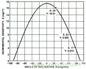 為了滿足應用在整個傾斜角檢測范圍內分辨率的要求,可以利用上圖的曲線來確定系統的最小靈敏度。假設應用要求最小分辨率為1°,傾斜角檢測范圍在-63°到+63°之間。根據上圖, 增量靈敏度在傾斜角0°到90°變化時, 逐漸變小,當到達63°時,靈敏度降至4.074mg/1°。