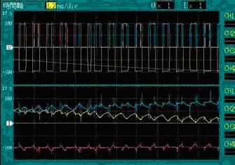 此外,3390還具備以X-Y圖表顯示來確認變頻器的動態特性的功能,變頻器不可或缺的諧波測量功能,用FFT評估影響變頻器的干擾的功能(可達100kHz)等(圖2)。而且,利用3390的500k采樣/秒的高速采樣率,來顯示電壓/電流波形(圖3)。之前,需要使用數字示波器和差分探頭、鉗式電流傳感器來觀測波形,非常麻煩,現在1臺3390即可實現。