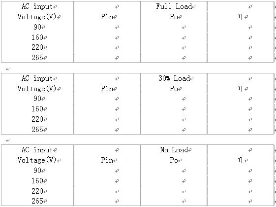 1.內(nèi)容:測(cè)試不同交流輸入電壓,不同負(fù)載條件下電源效率η